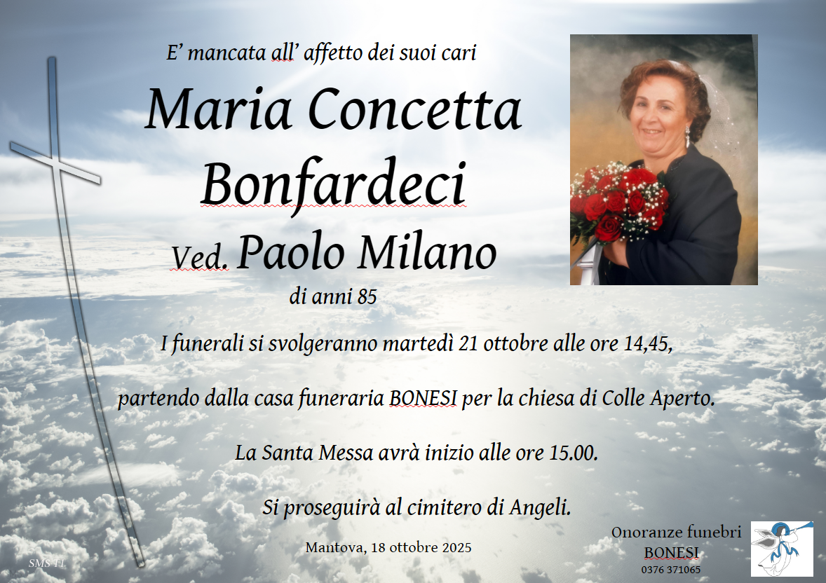 I funerali si svolgeranno lunedì 20 ottobre alle ore 14.40,partendo dalla casa funeraria BONESI per