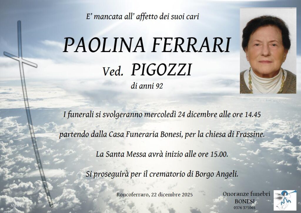 I funerali si svolgeranno sabato 22 novembre alle ore 9.45, partendo dalla Casa Funeraria Bonesi per il Centro Parrocchiale di San Giorgio Bigarello. La Santa Messa avrà inizio alle ore 10.00. Si proseguirà al cimitero di Frassine. San Giorgio di Mantova, 19 novembre 2025