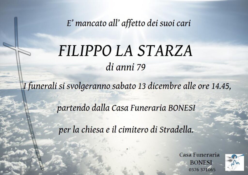 I funerali si svolgeranno sabato 13 dicembre alle ore 14.45, partendo dalla Casa Funeraria BONESI per la chiesa e il cimitero di Stradella.