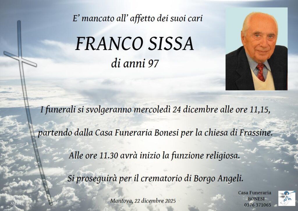 I funerali si svolgeranno mercoledì 24 dicembre alle ore 11,15, partendo dalla Casa Funeraria Bonesi per la chiesa di Frassine. Alle ore 11.30 avrà inizio la funzione religiosa. Si proseguirà per il crematorio di Borgo Angeli.   Mantova, 22 dicembre 2025
